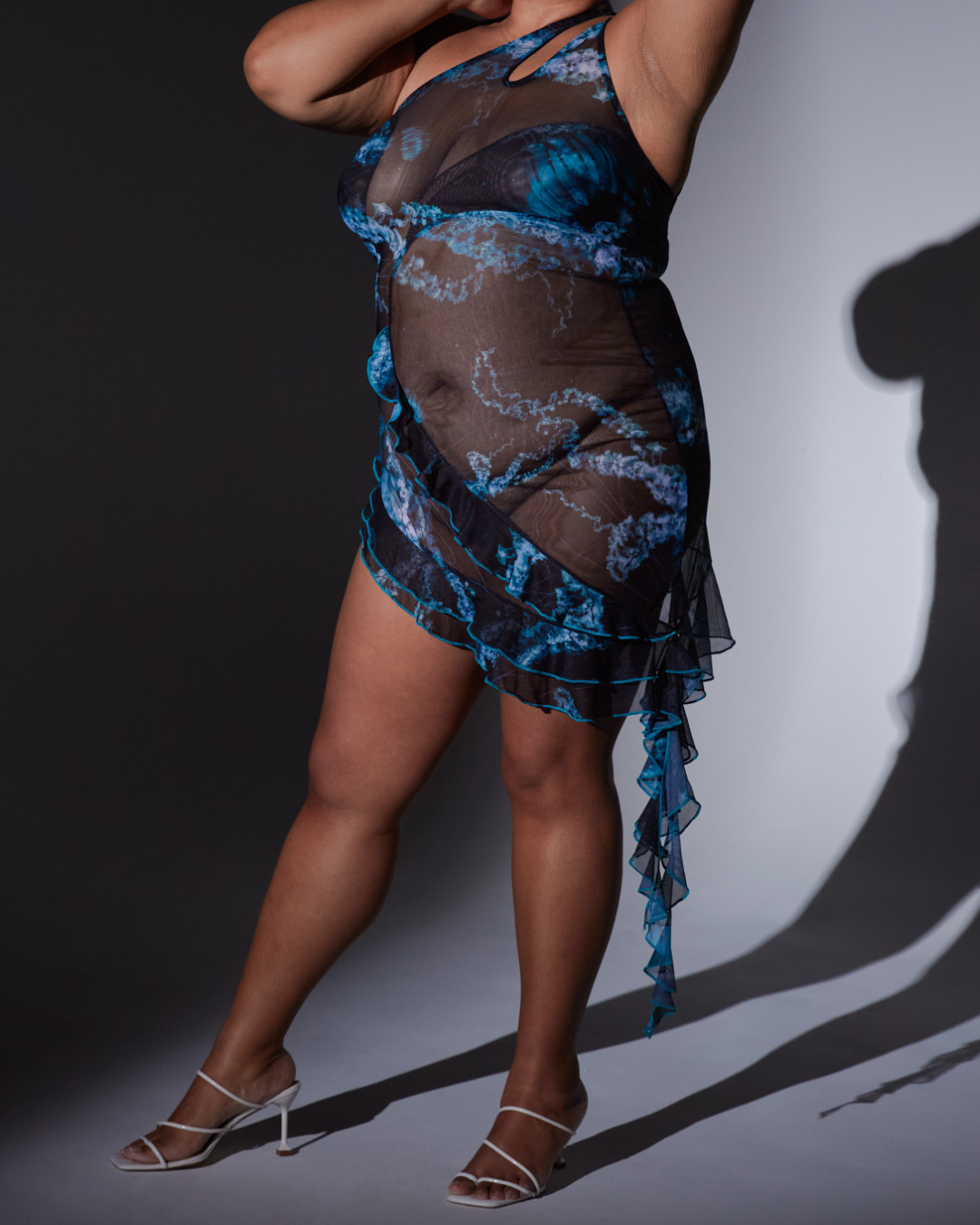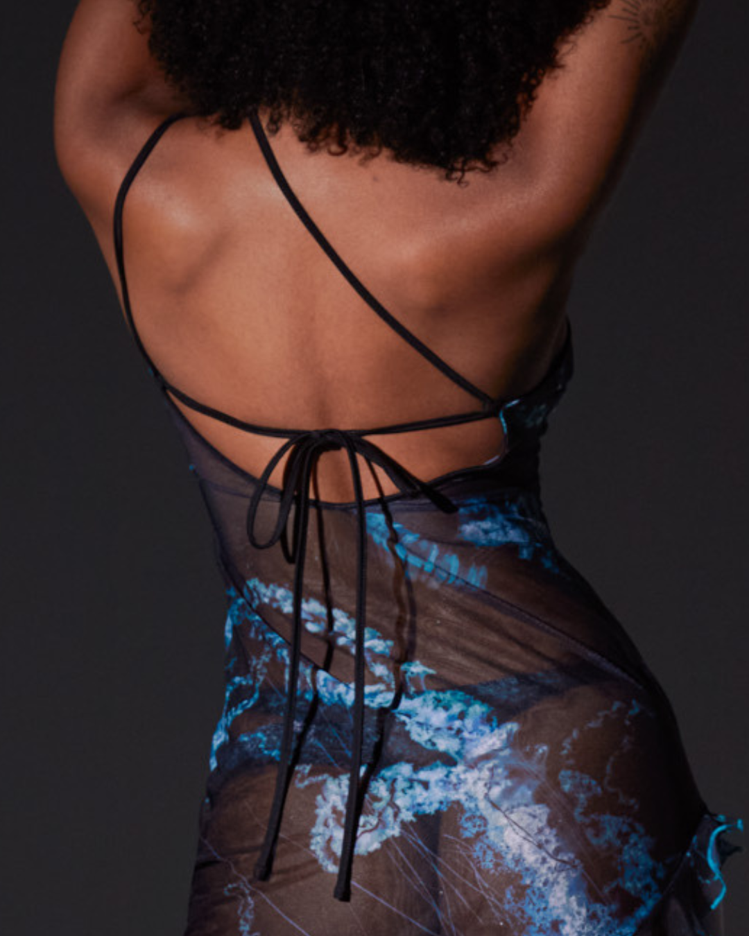 Custom T&S print stretch mesh and microfiber Slip dress with asymmetrical layered ruffle skirt, cascading spiral ruffles, strappy tie at back and statement cutout at front neckline.