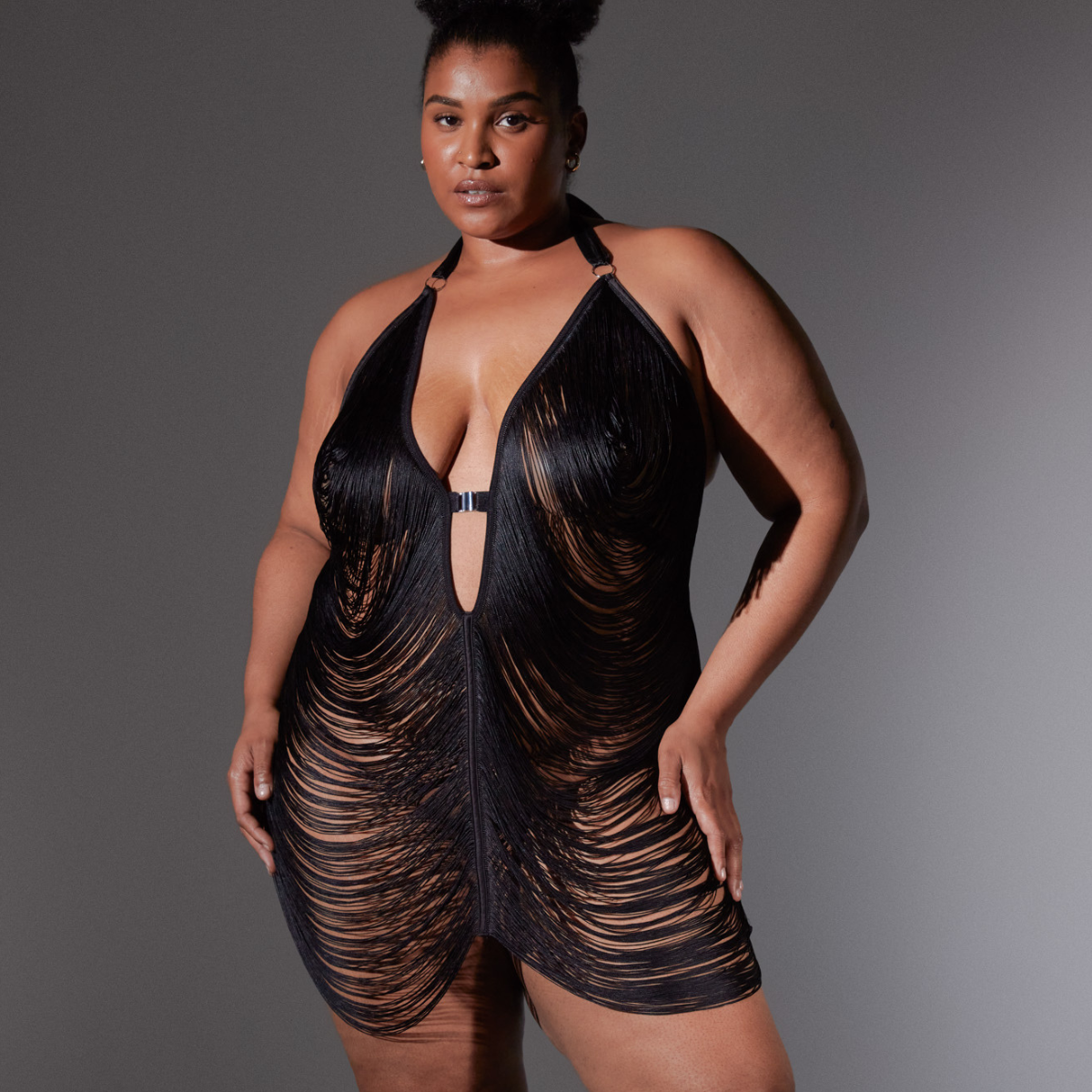 Let’s be Fringe with benefits! Duel sized full slip for maximum adjustability, this ornamental halter dress features a draping fringe to frame your curves in all of the right places with a satin bow closure at the nape of the neck.