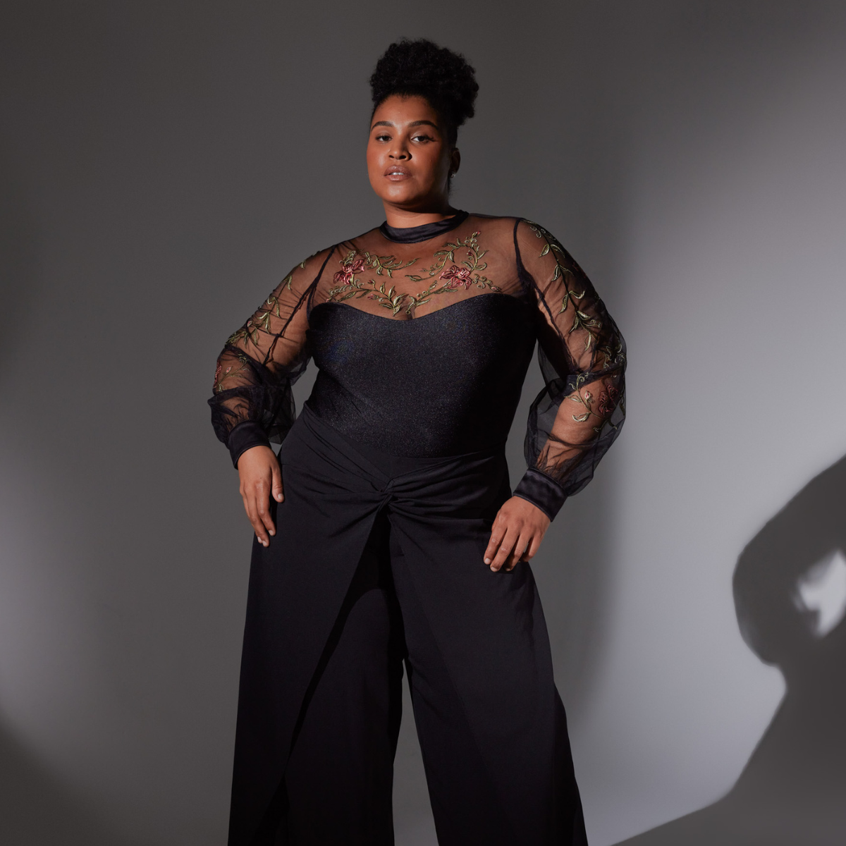 - Stretch mesh body with balloon sleeve tulle