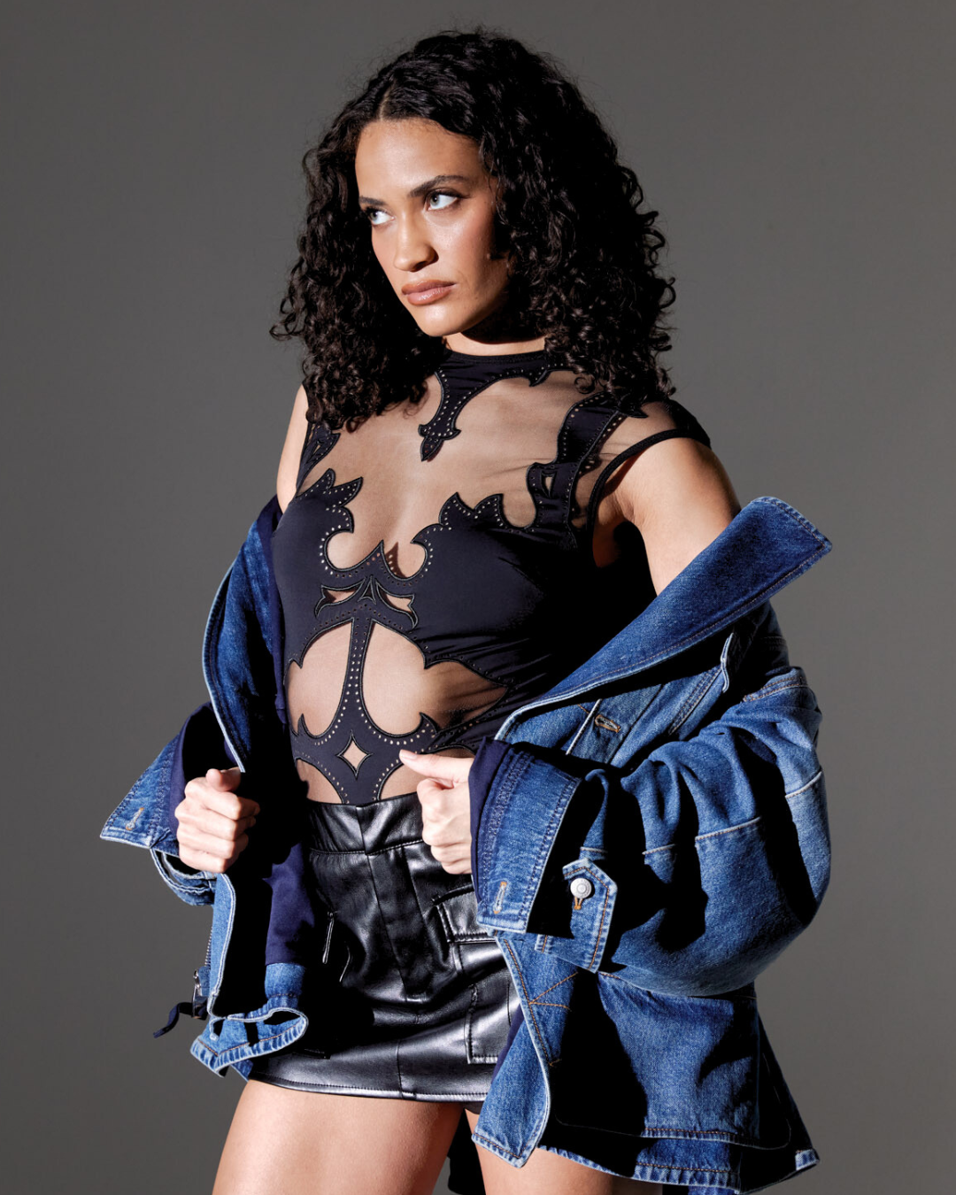 Custom T&S appliquéd tulle and microfiber bodysuit with lazercut detailing and easy-close magnetic clasp at back neck.