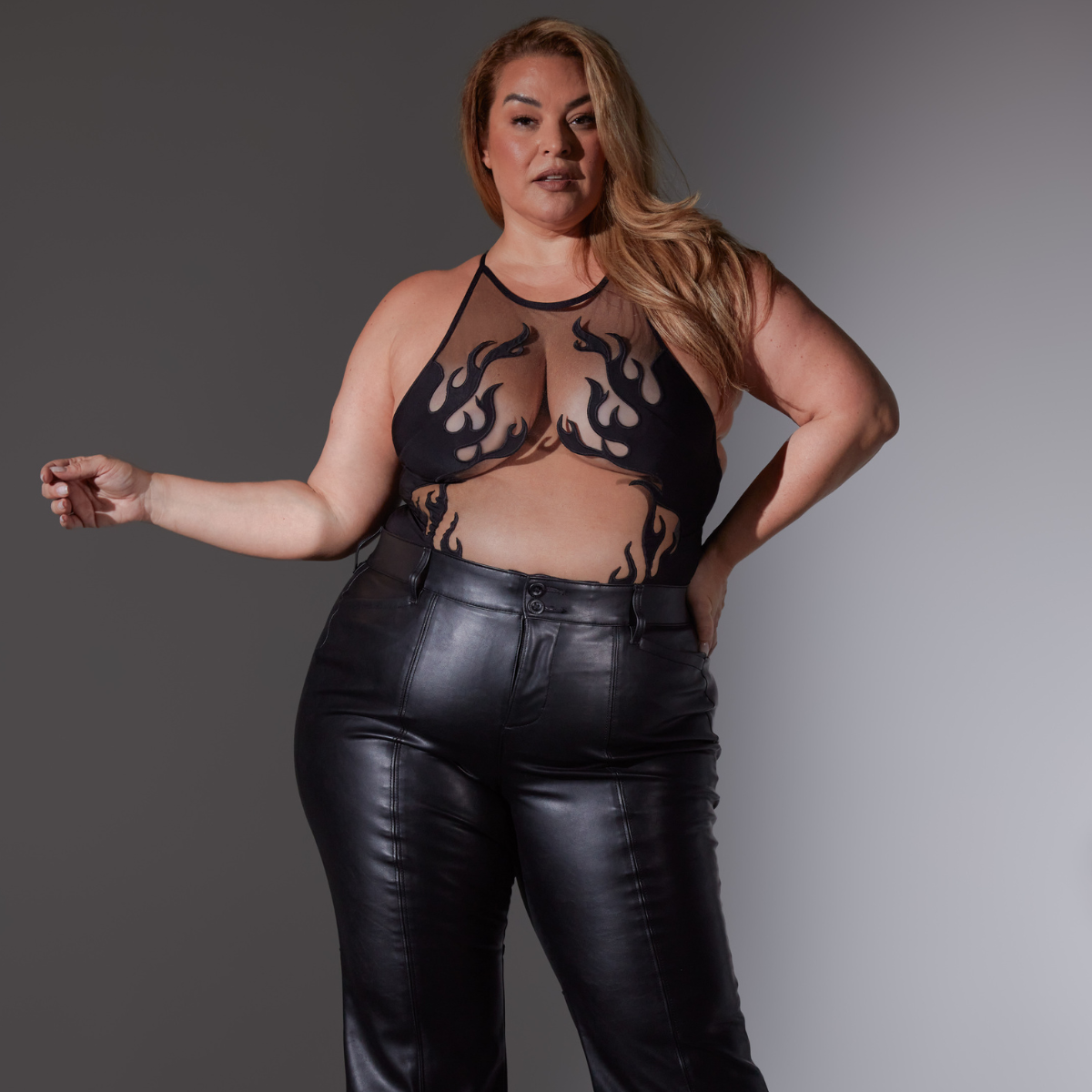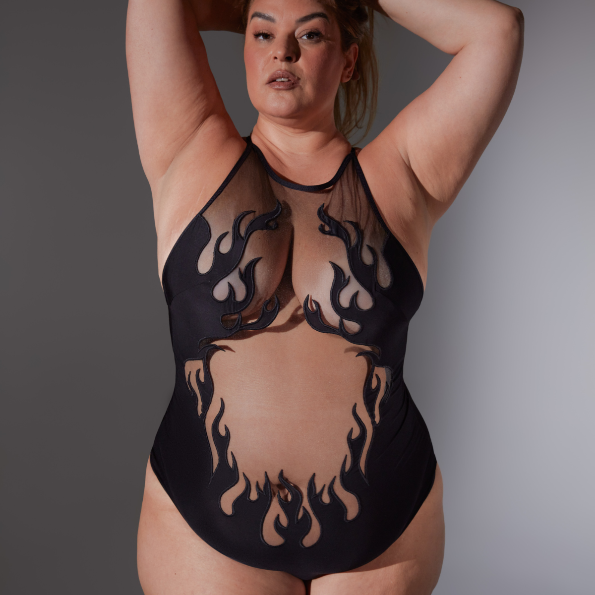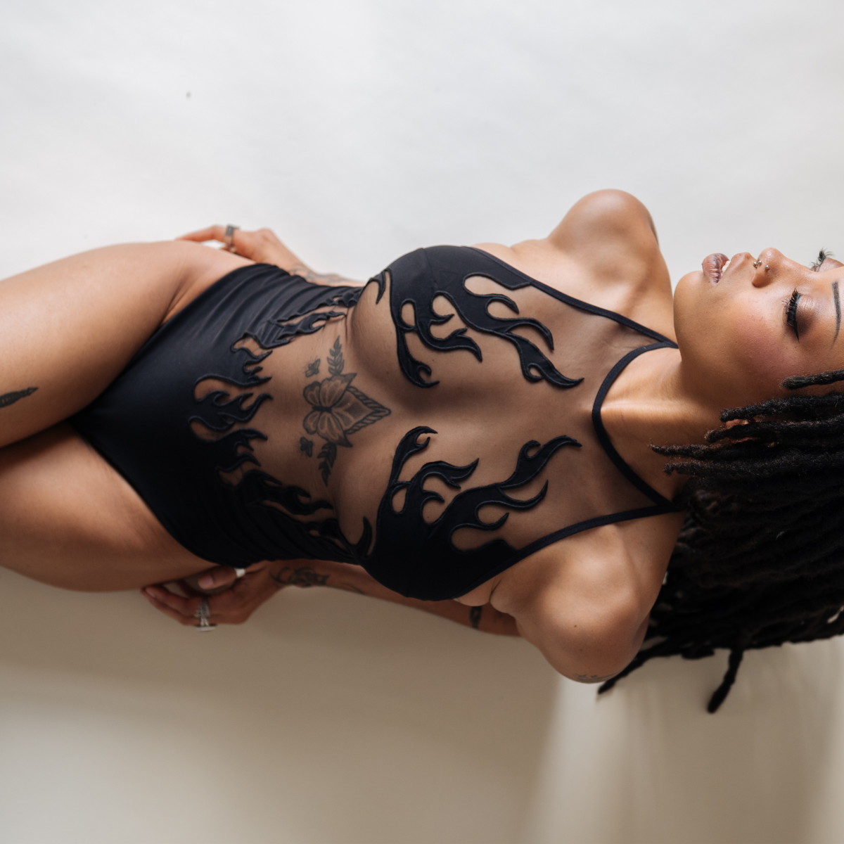 Black bodysuit with fire embroidery and thong back. No snaps at gusset.